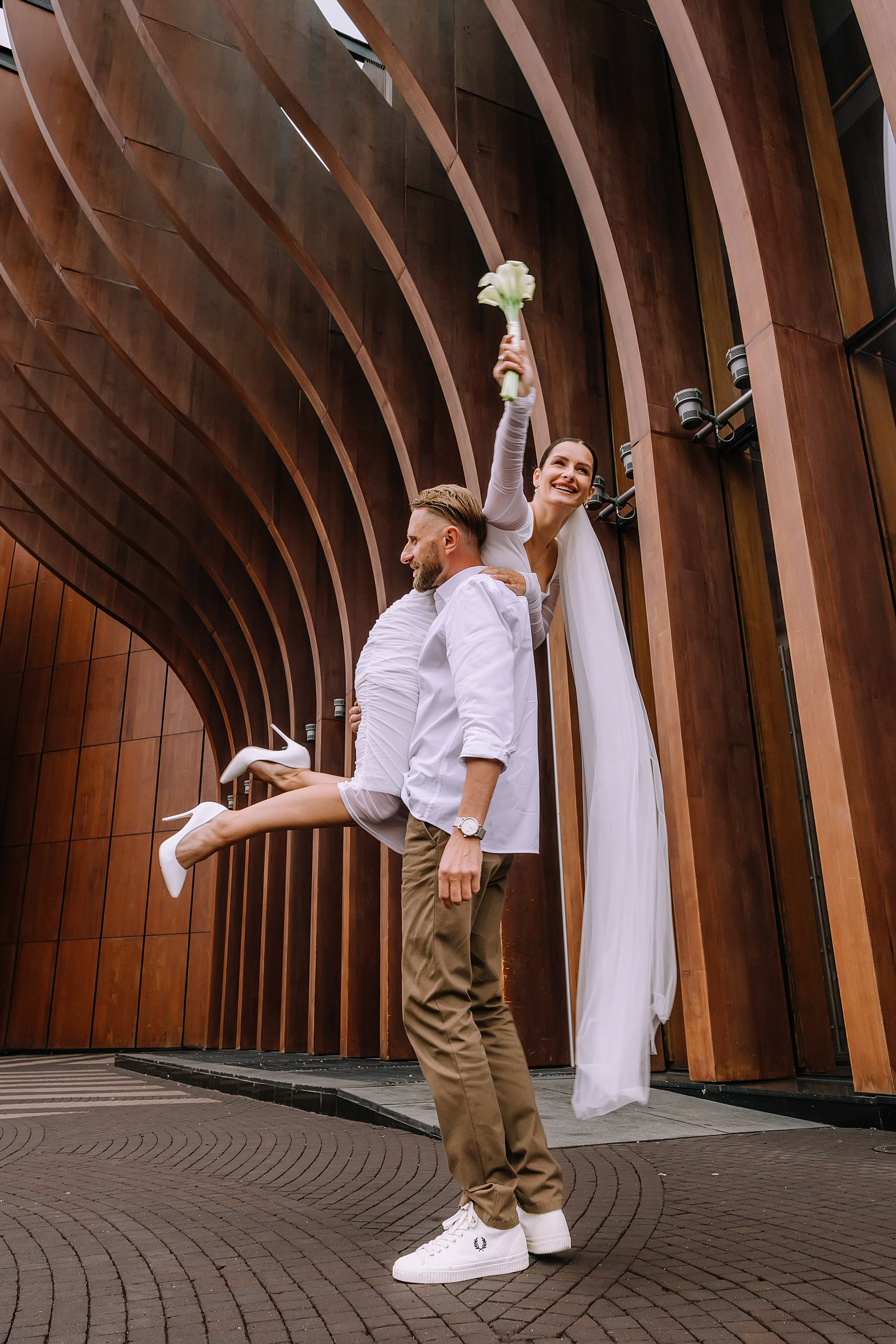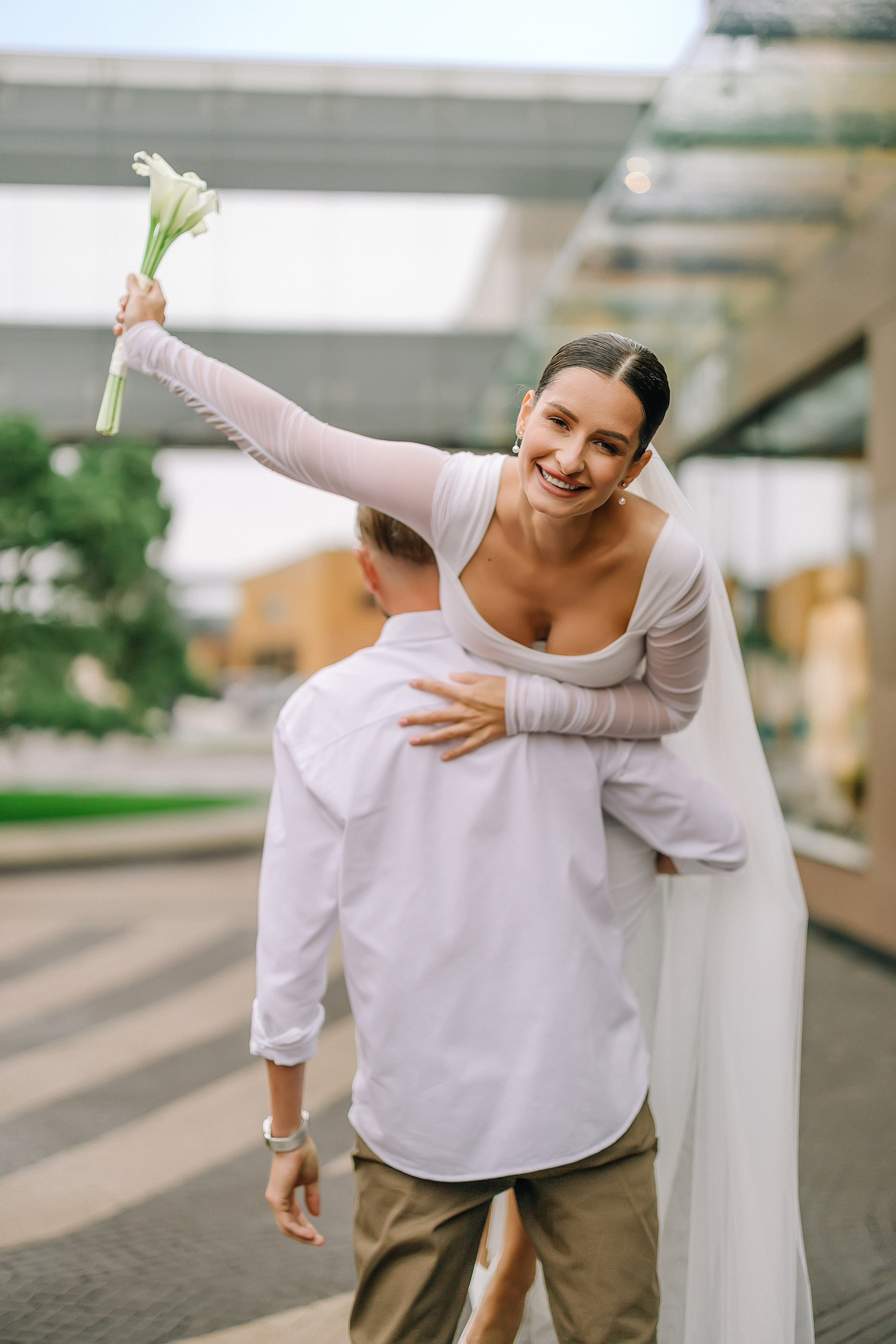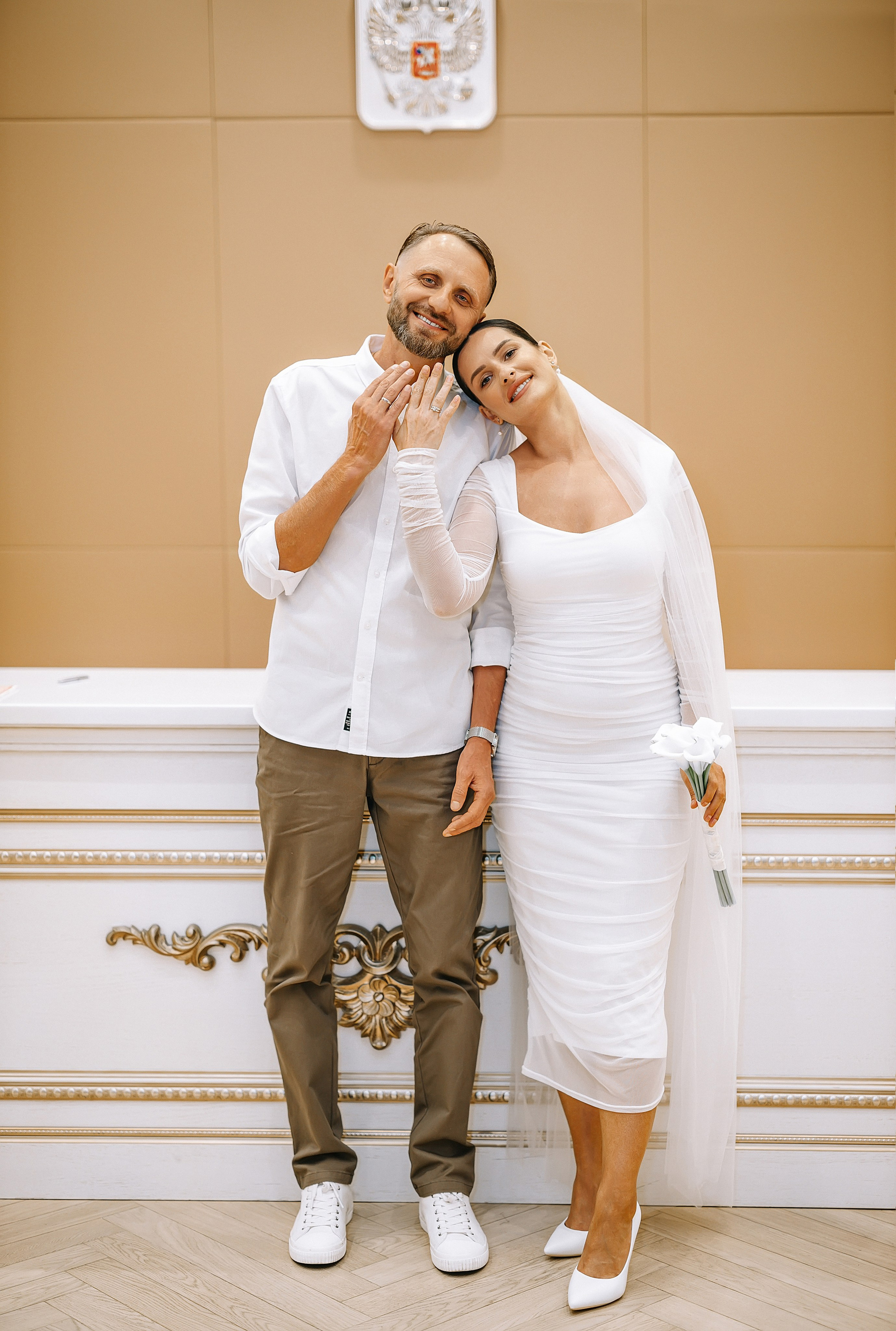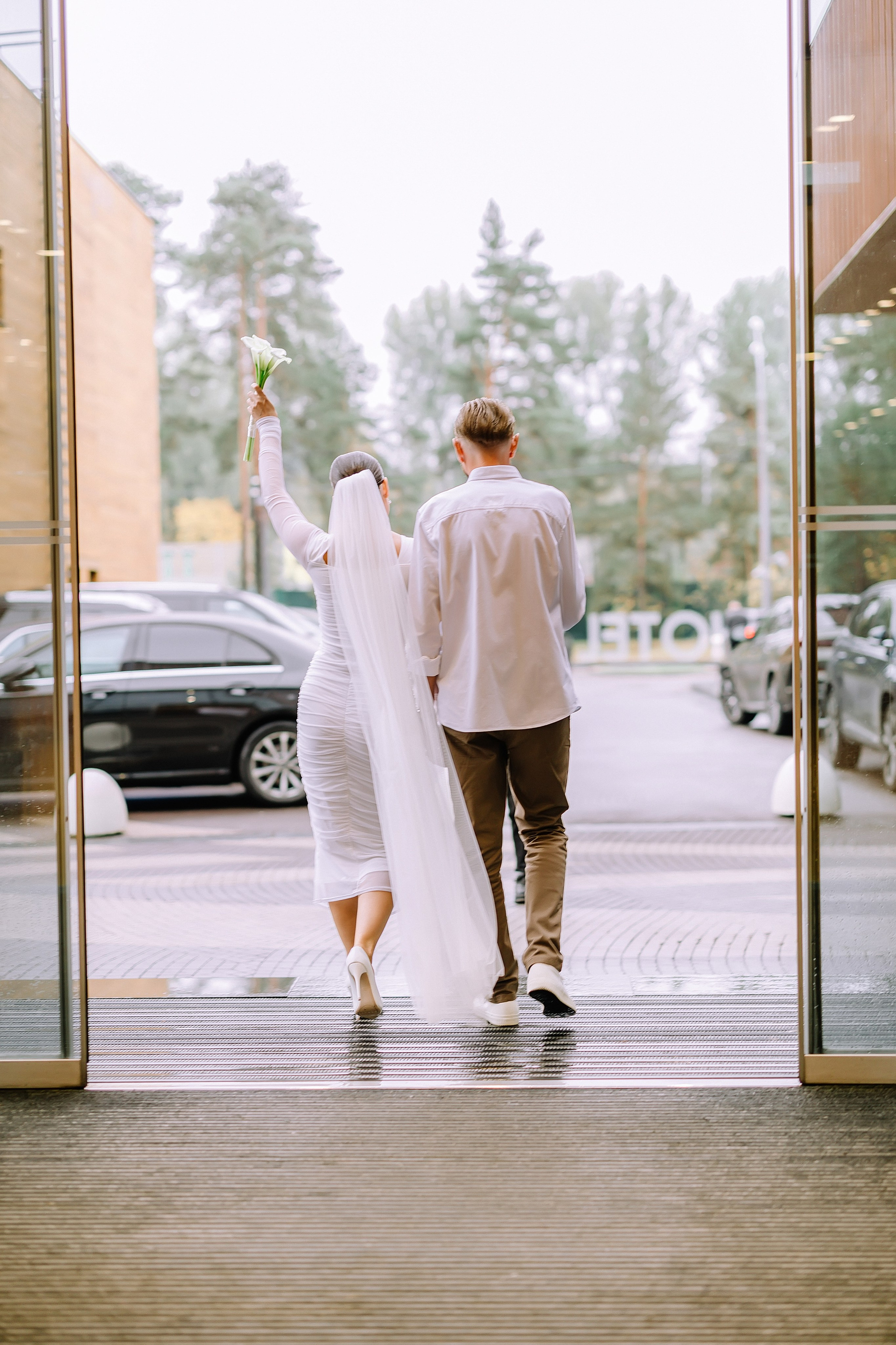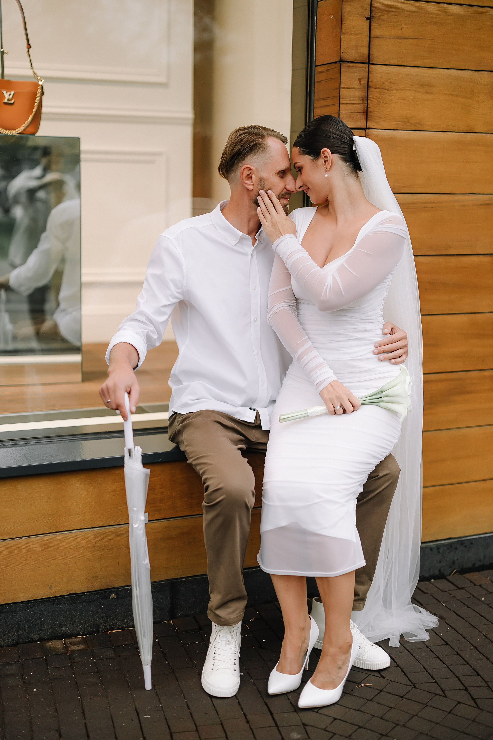 С букетом, что прижат к груди едва,